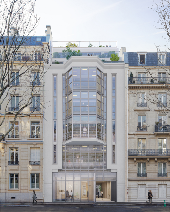 Vu de l’extérieur, l’immeuble séduit par son architecture aux lignes claires d’inspiration Art Déco, avec sa façade signature en bow window sur le boulevard de Courcelles.